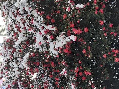 今朝、出社前に私用のため郡山駅に向かったんですが、赤い花びらと白い雪のコントラストが綺麗だったので、足を止めてパシャリと1枚。