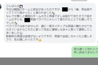 お母さまからいただいたLINEによりますと、韓国チームとの交流戦で、向こうの選手を英語でコミュニケーションをするチャンスがあったとのこと。