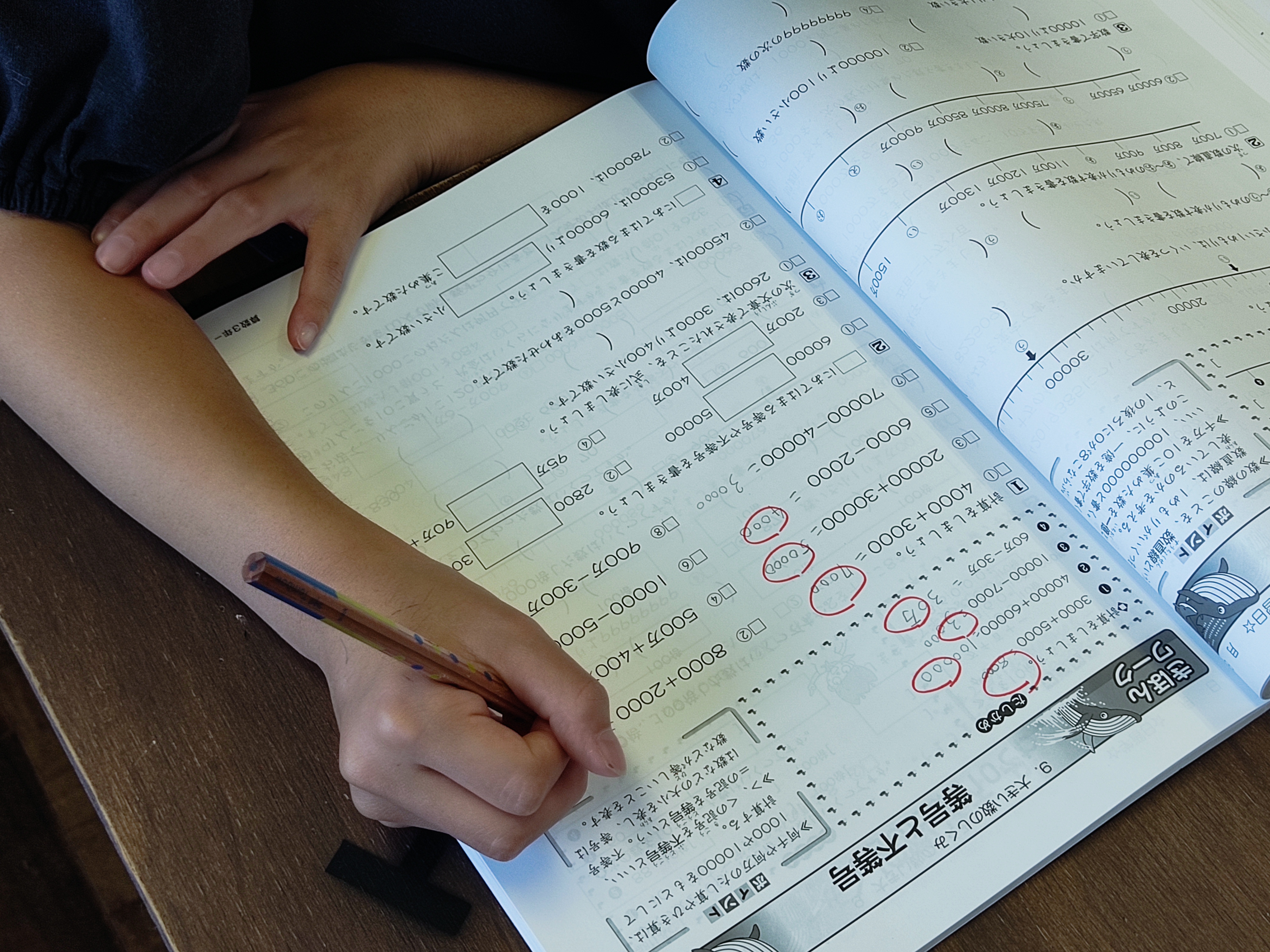 ただ、多くの小学生のテキストの多くは、計算ドリルを除いて大抵問題が「横並び」に作られていますから、どうしても「横」に解き進める感じになってしまうんですね。