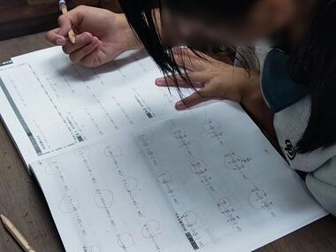 こちらの画像の生徒さんはその中の1人。すでに小学6年生用の通年テキストの学習を終えていまして、内容もよく理解できているため、「もう、中学生の内容に入ろうよ!」と私から提案をしてスタートしていただいています。