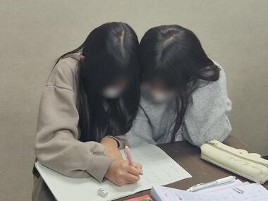 追伸:授業終了後、お家の方のお迎えを待ちながら宿題をしていた女子生徒さんの様子。ほんと仲良しで、まるで双子の姉妹のようです。笑
