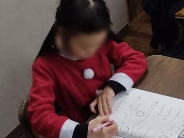 可愛らしいサンタさんのコスチュームに身を包んで教室に来てくれた小学生Mちゃん。
