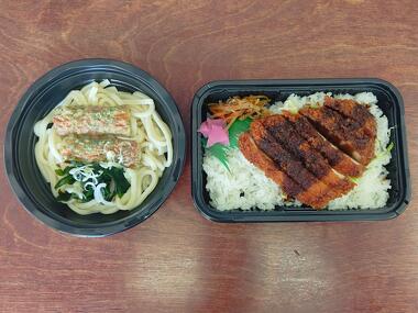 今年の昼食は、うすい百貨店地下1階にある「至高の塩むすび/(株)RONDO.」さまにお願いをして「受験に勝つ!」にちなんだ「大盛りカツ弁当」と「年越しうどん」をご準備させていただきました!