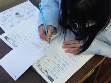 例えば、画像の生徒さんの様子を見ていただけますか。テキストの上に紙が置いてあるの分かりますか?これ、計算用紙ではなくて「公式を隠させている」んですね。