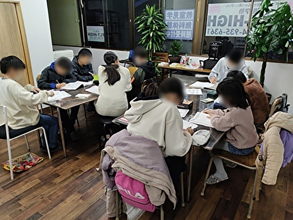 再開初日は宿題や自習をするために早く教室入りした生徒さん、逆に授業が終わった後も残って学習していたためテーブルが満席状態でした。(笑)