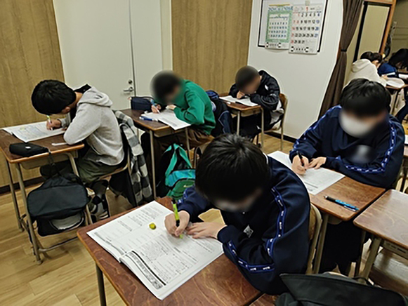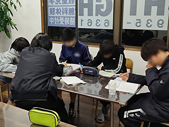 卒業生もサポートに入ってくれているため、習熟度によって少人数グループごとに学習を進めていただいています。