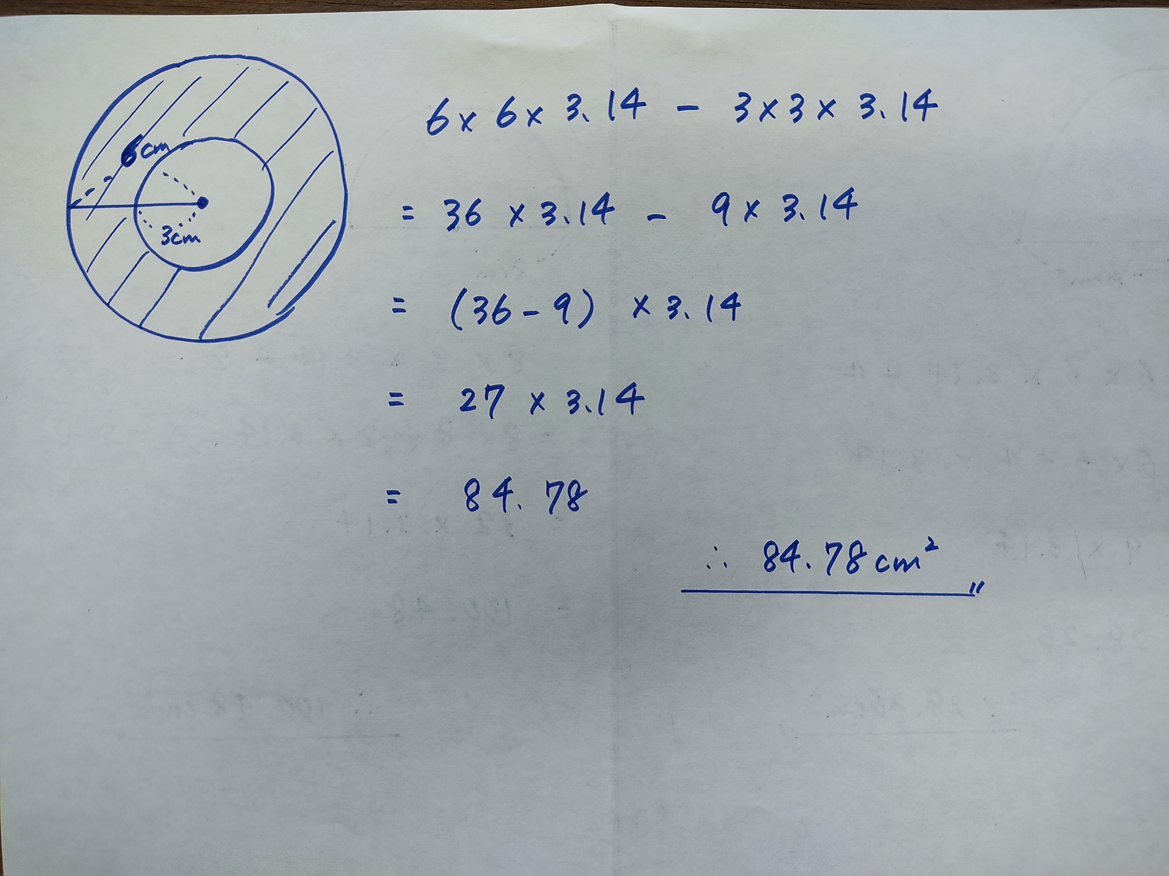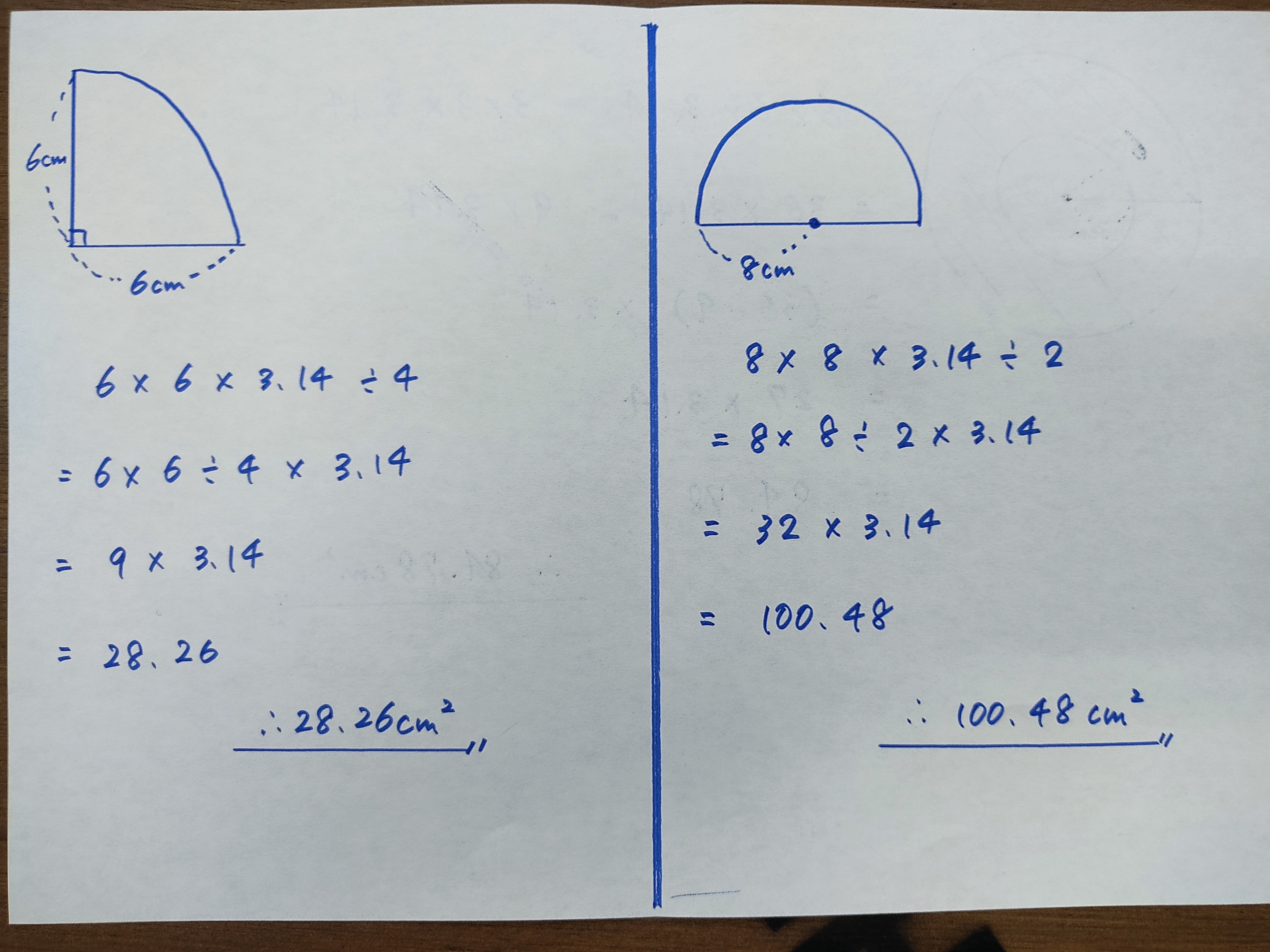 この単元は「面積=半径×半径×3.14」という公式に数値を当てはめて計算するという単純な単元の1つ。