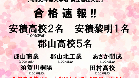 平素より、進学塾FLY-HIGHのホームページをご利用いただき誠にありがとうございます。 「令和8年度入学 県立高校入試」の合格発表結果は下記の通りでした。 合格者の皆さん、本当におめでとうございました。